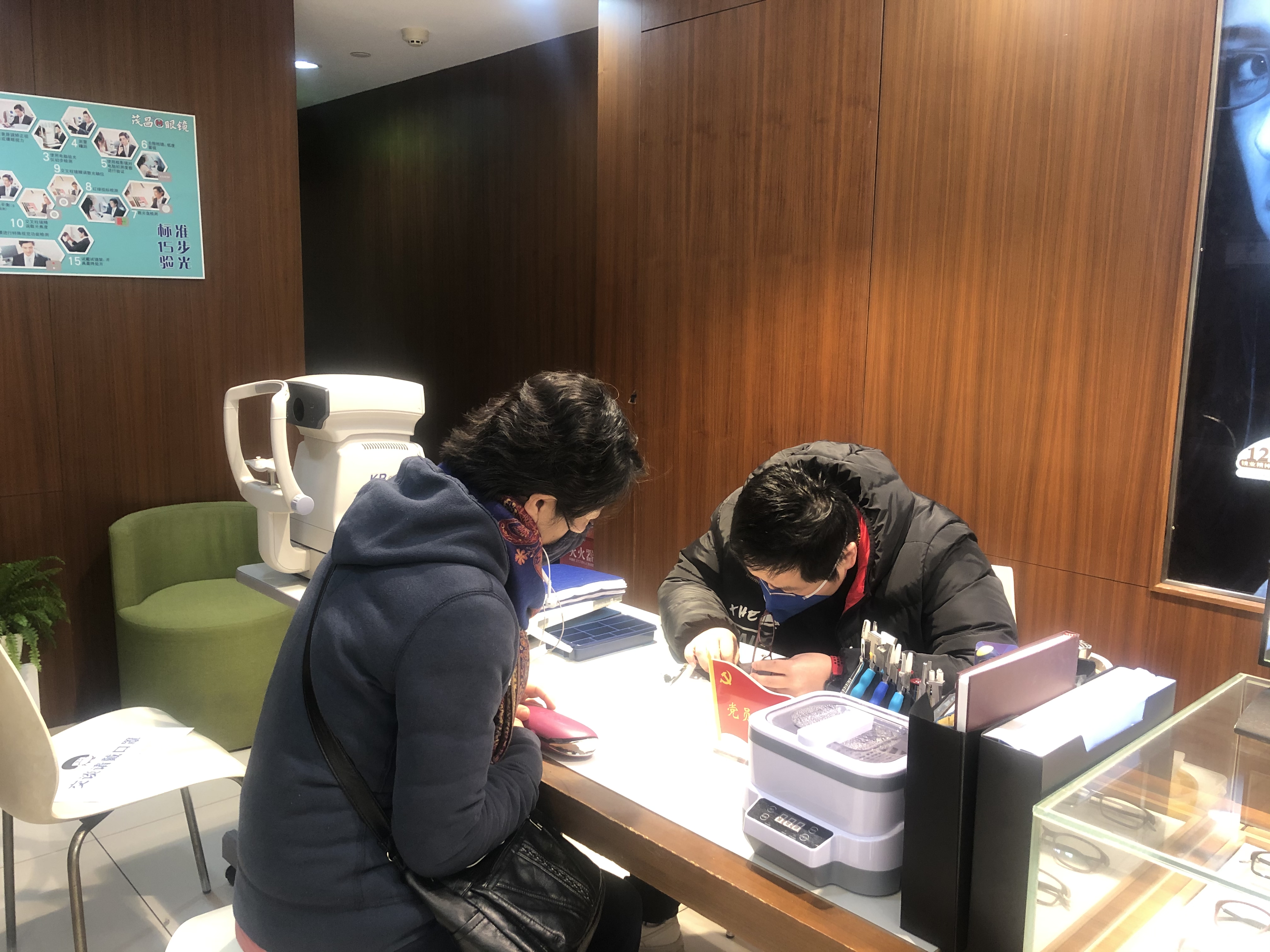 留下的联系方式正是店长朱海峰,他与阿姨约定时间到店解决。到了约定日,茂昌眼镜徐汇店的员工们提前到达门店,进行门店消毒工作。阿姨如约到店后,店长和修理员发现这副眼镜全进口,零件是一一对应的,根本没有现成的,于是拆了五六副类似的眼镜小螺丝来合,还是没有适合的小螺丝,最后发现是镜架曾经摔过,有个细微裂缝,螺丝口滑牙拧不紧了。店长和修理员并没有就此罢手,两人千方百计地试验摆弄,足足一个小时,在阿姨的同意下,最终使用了502加上小螺丝黏起来,并表示待度过这特殊时期,再联系后续处理。